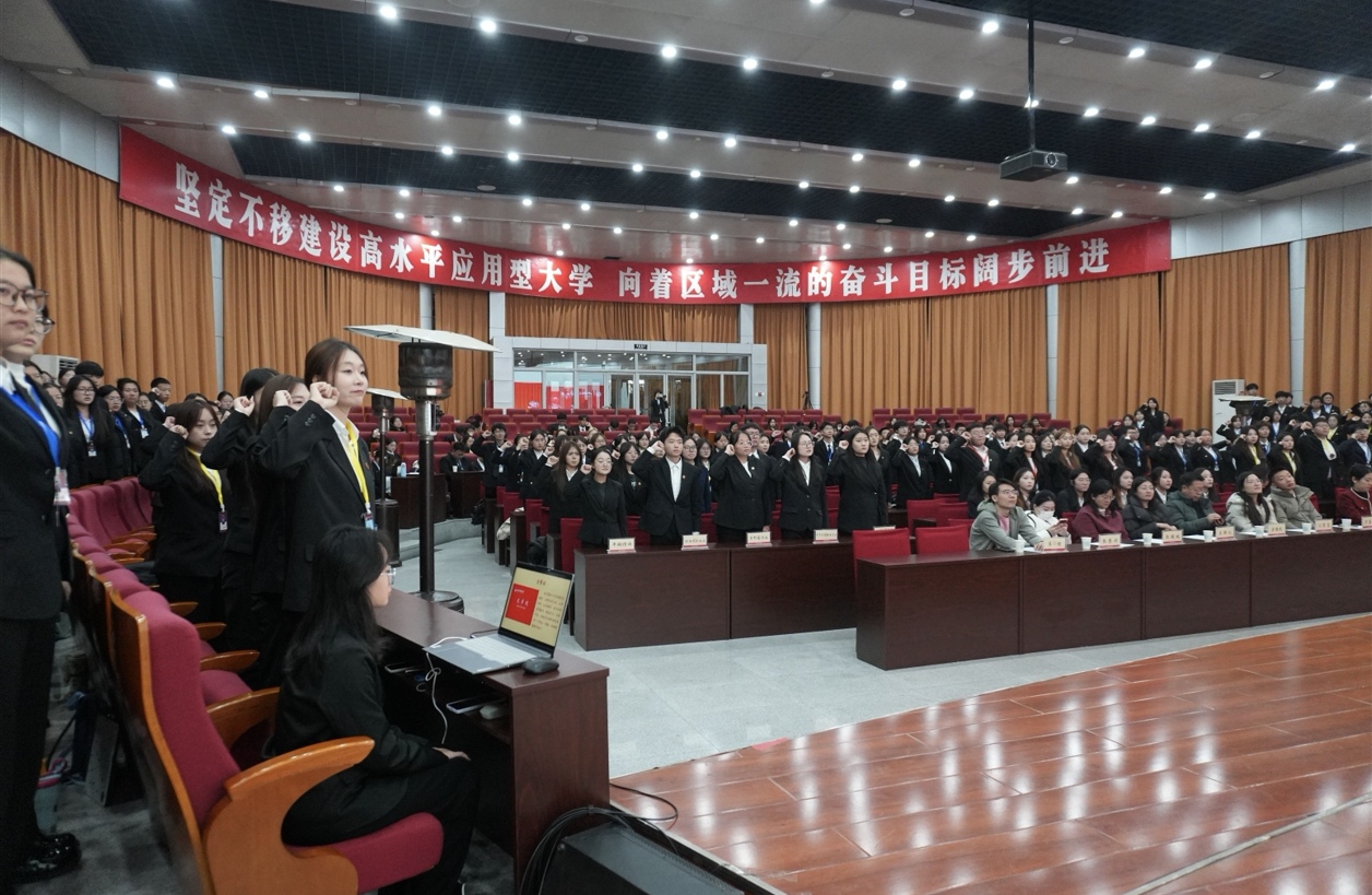 第十九届学生会主席毋运鑫带领全体新任团学组织干部进行入职宣誓。